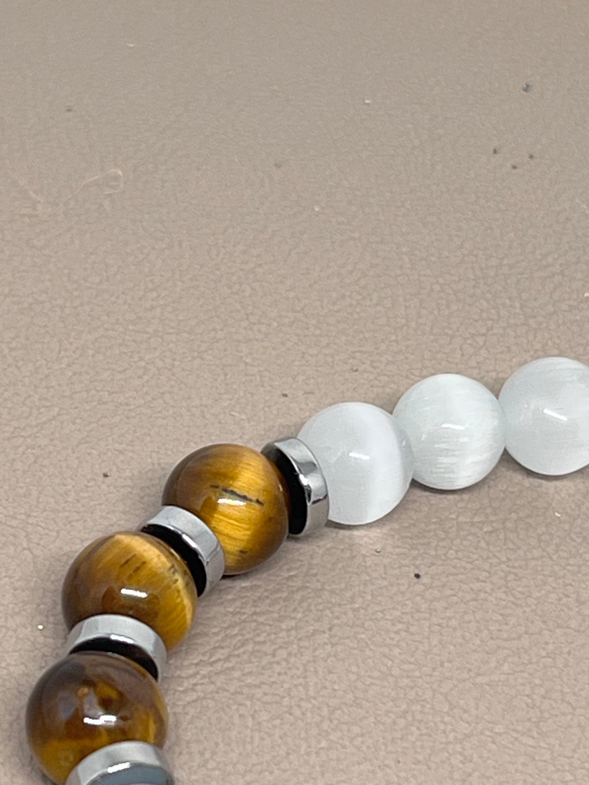🎨 Farge / steintype: Hvite katteøyne og brungule tigerøyne. 8mm. Sølvfarget hematitt.