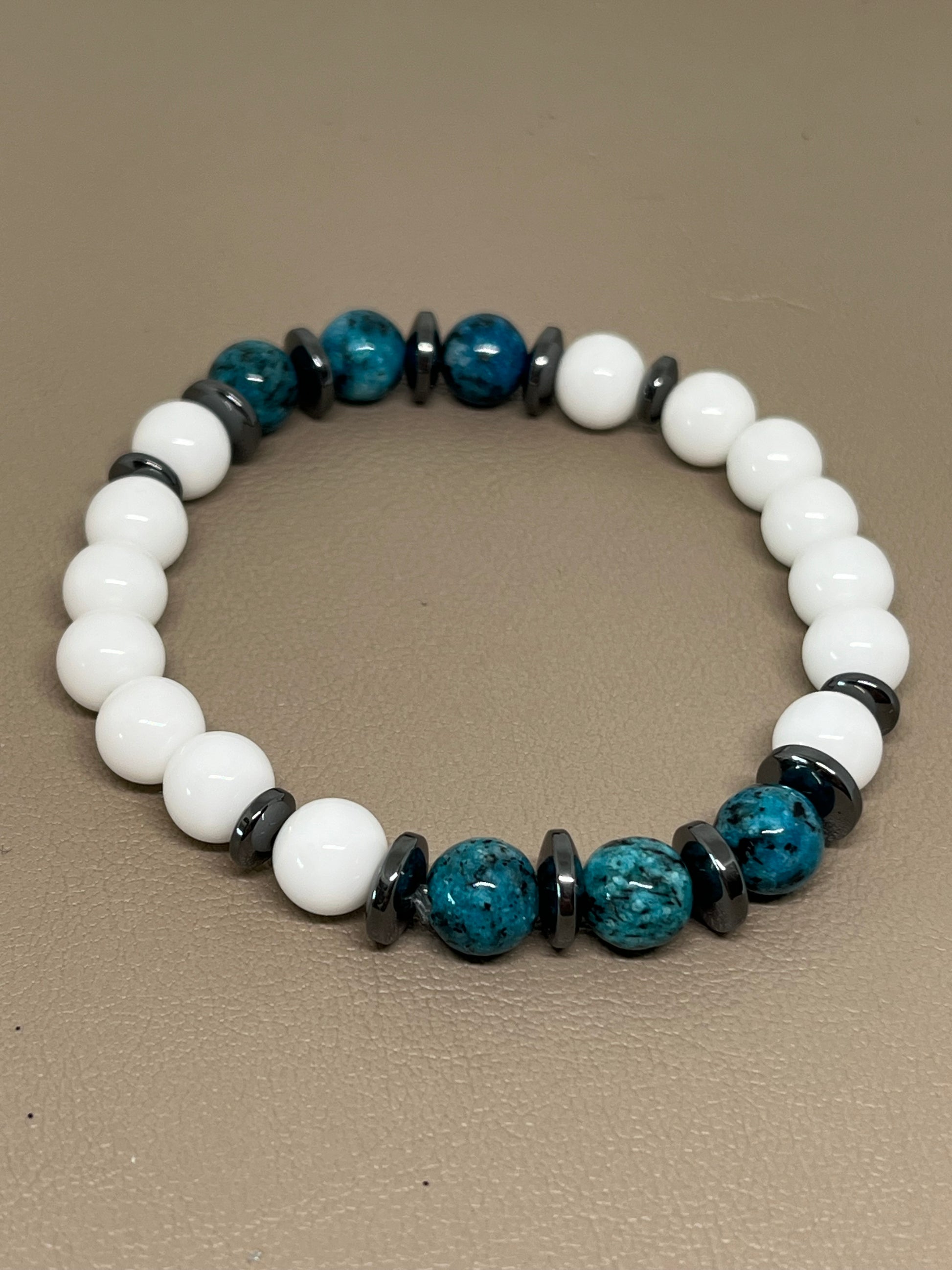 🎨 Farge / steintype: Blå kambaba Jasper, hvit agat og sort hematitt. 8mm.
