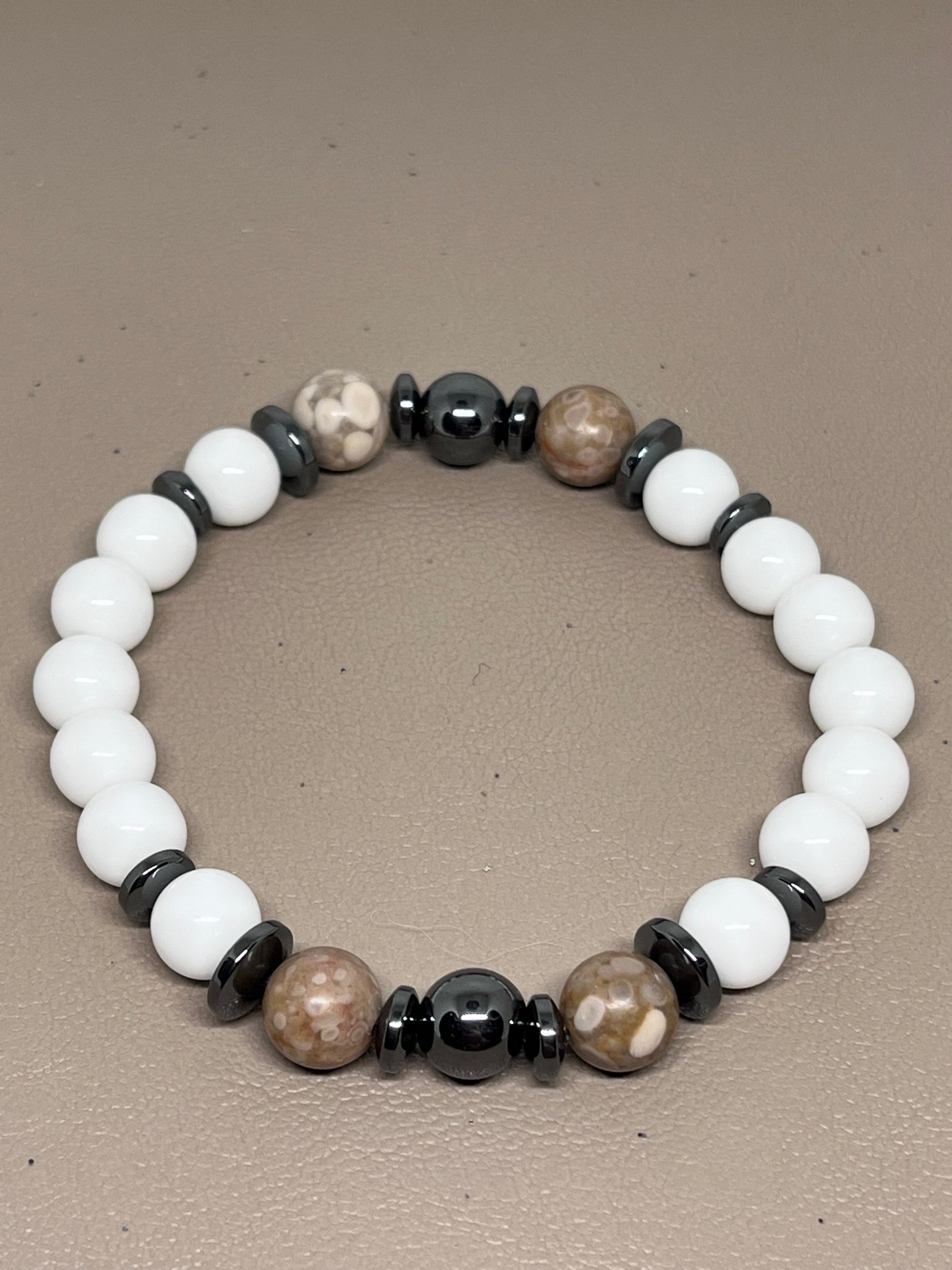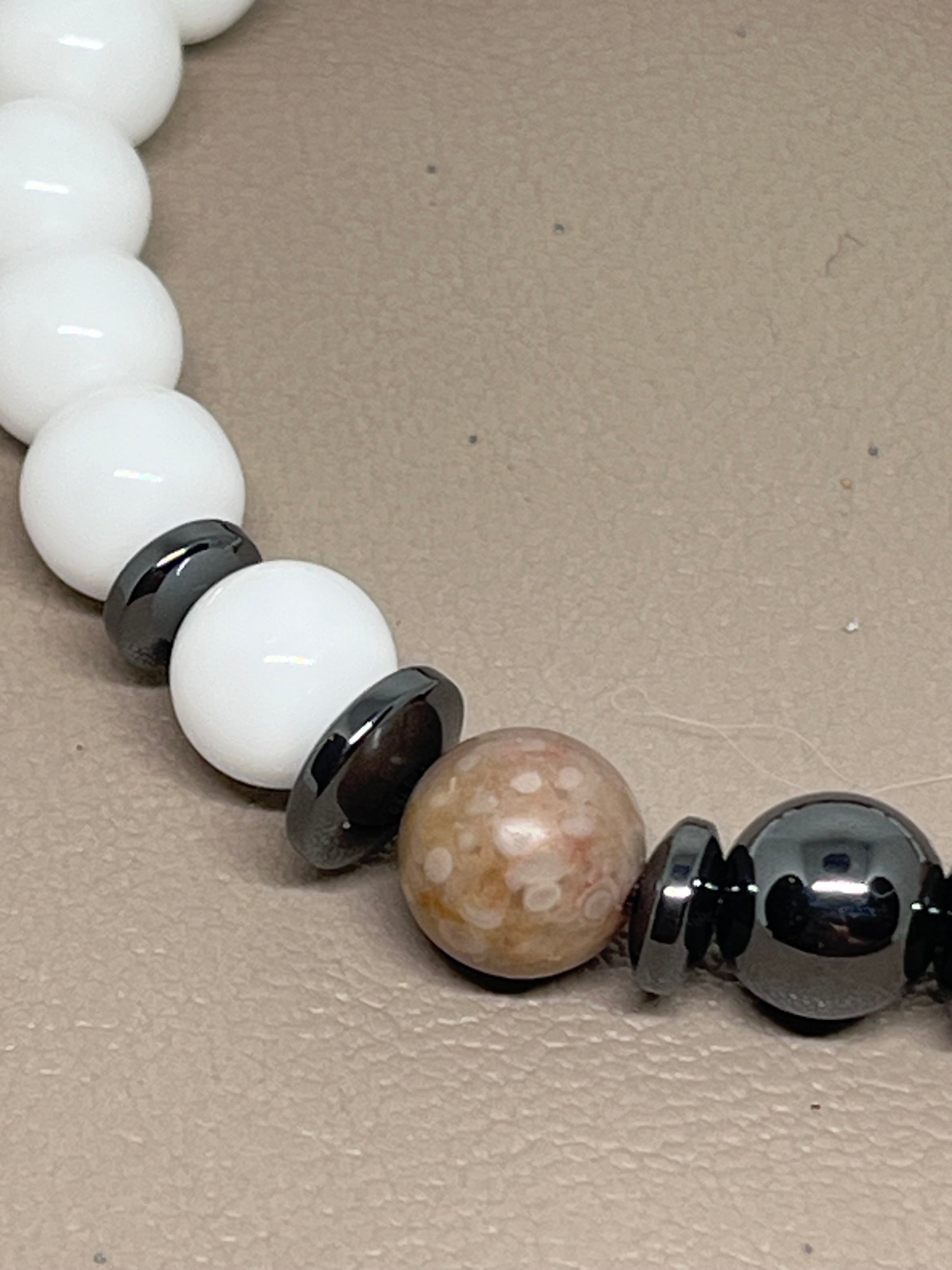 Perler: brun zeolitt, hvit agat og sort hematitt. 8mm.