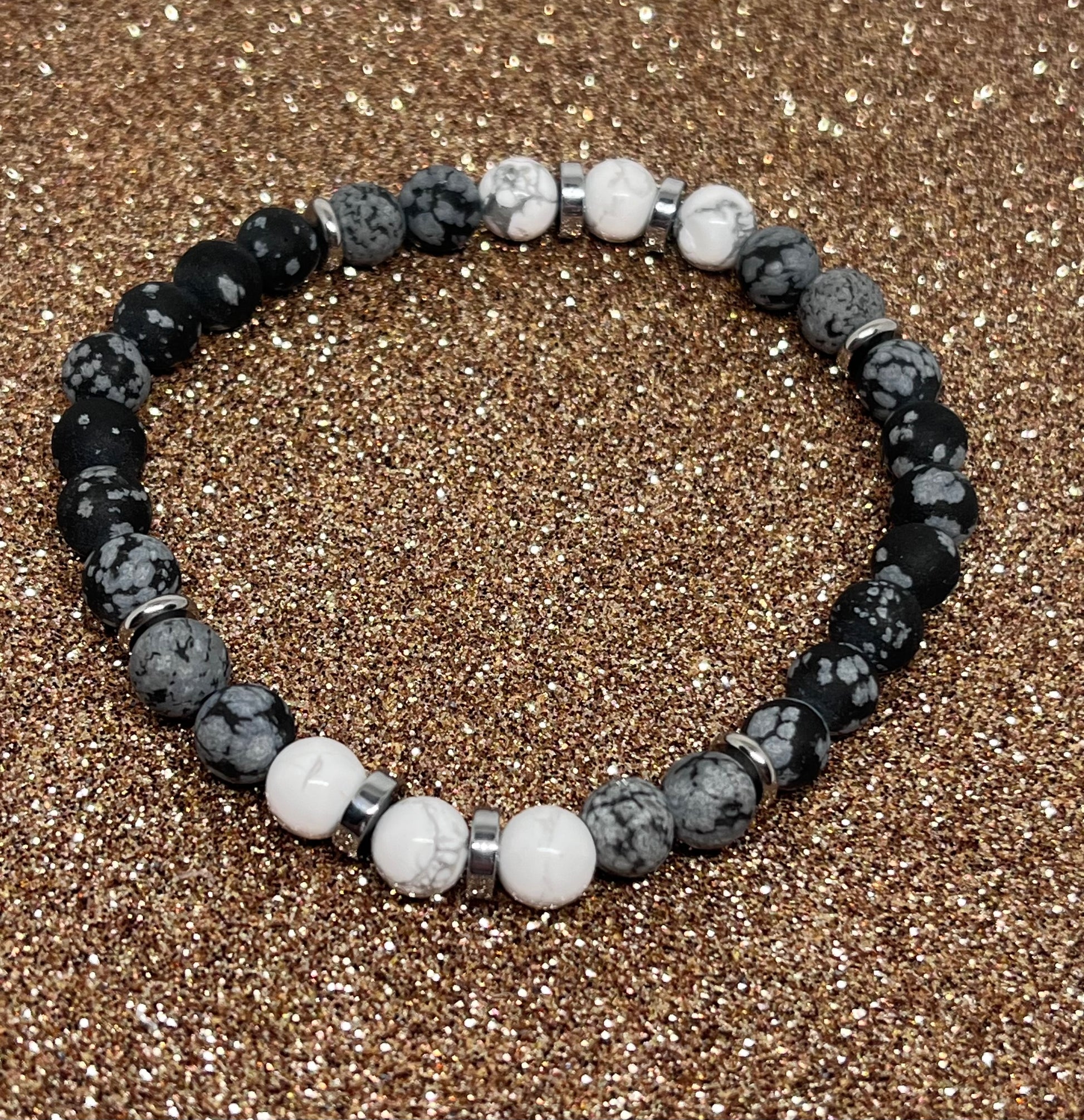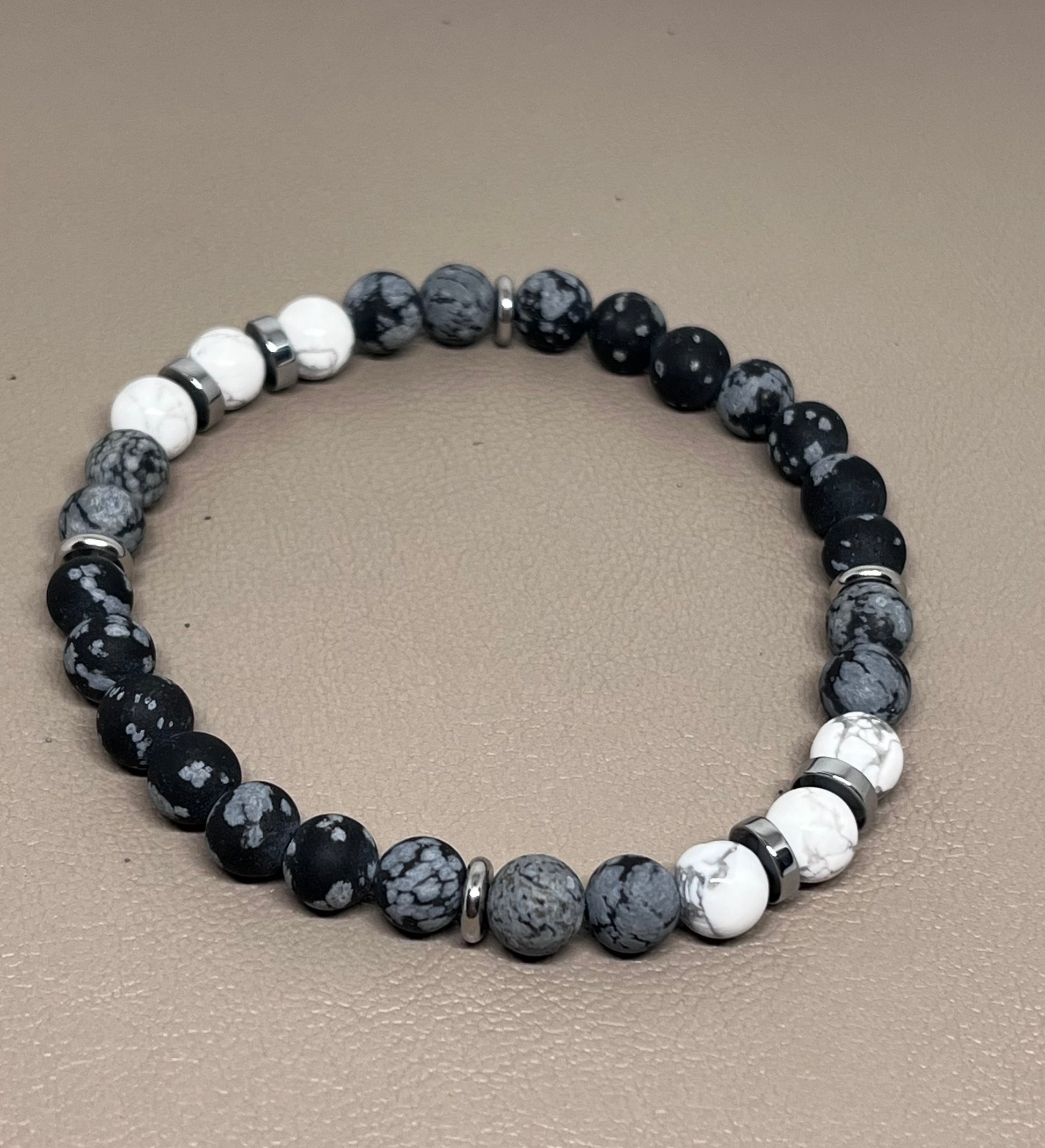 Perler av: Grå obsidian, hvite howlitt. Sølvfarget hematitt og rustfritt stål. 6mm.
