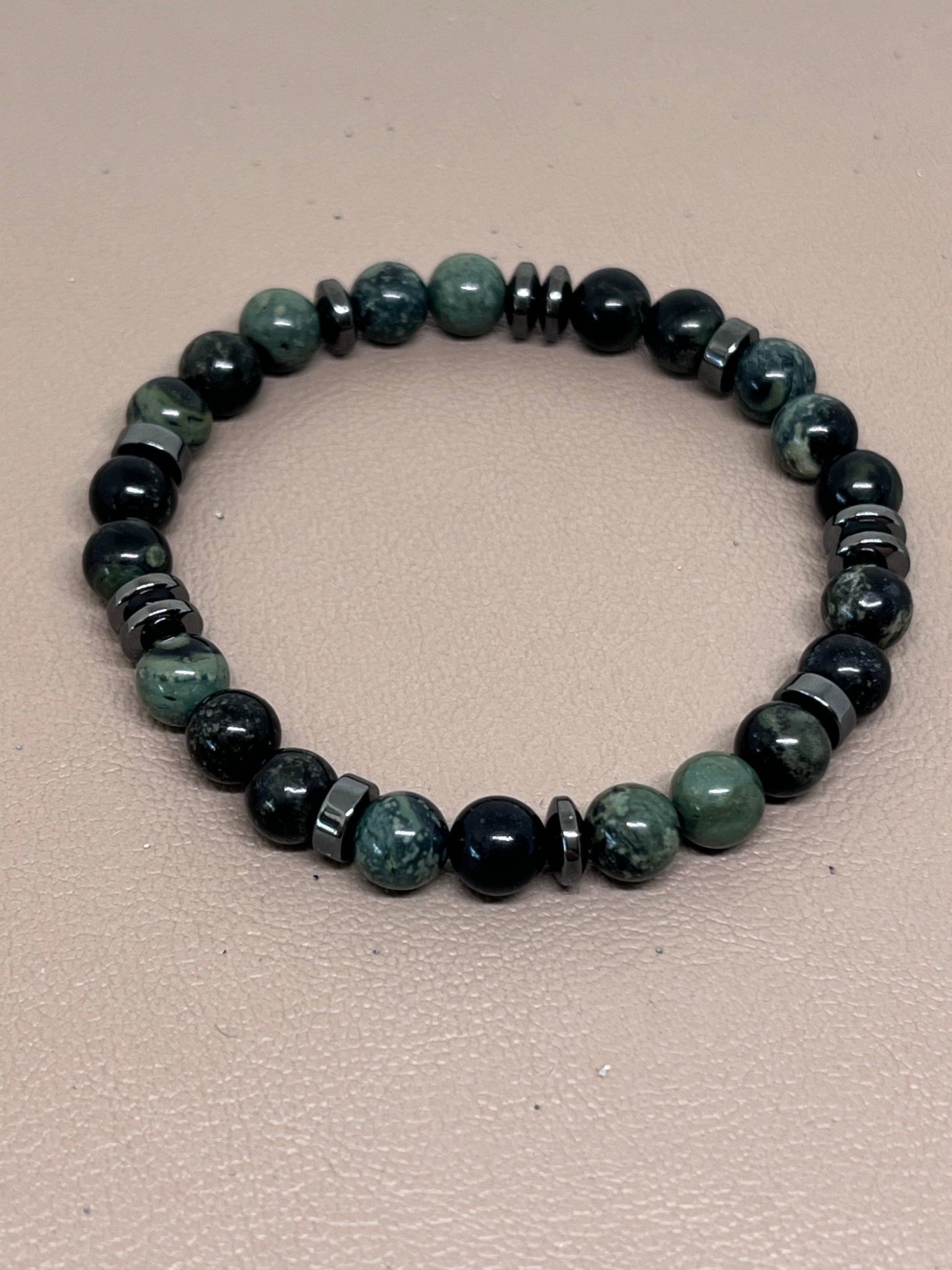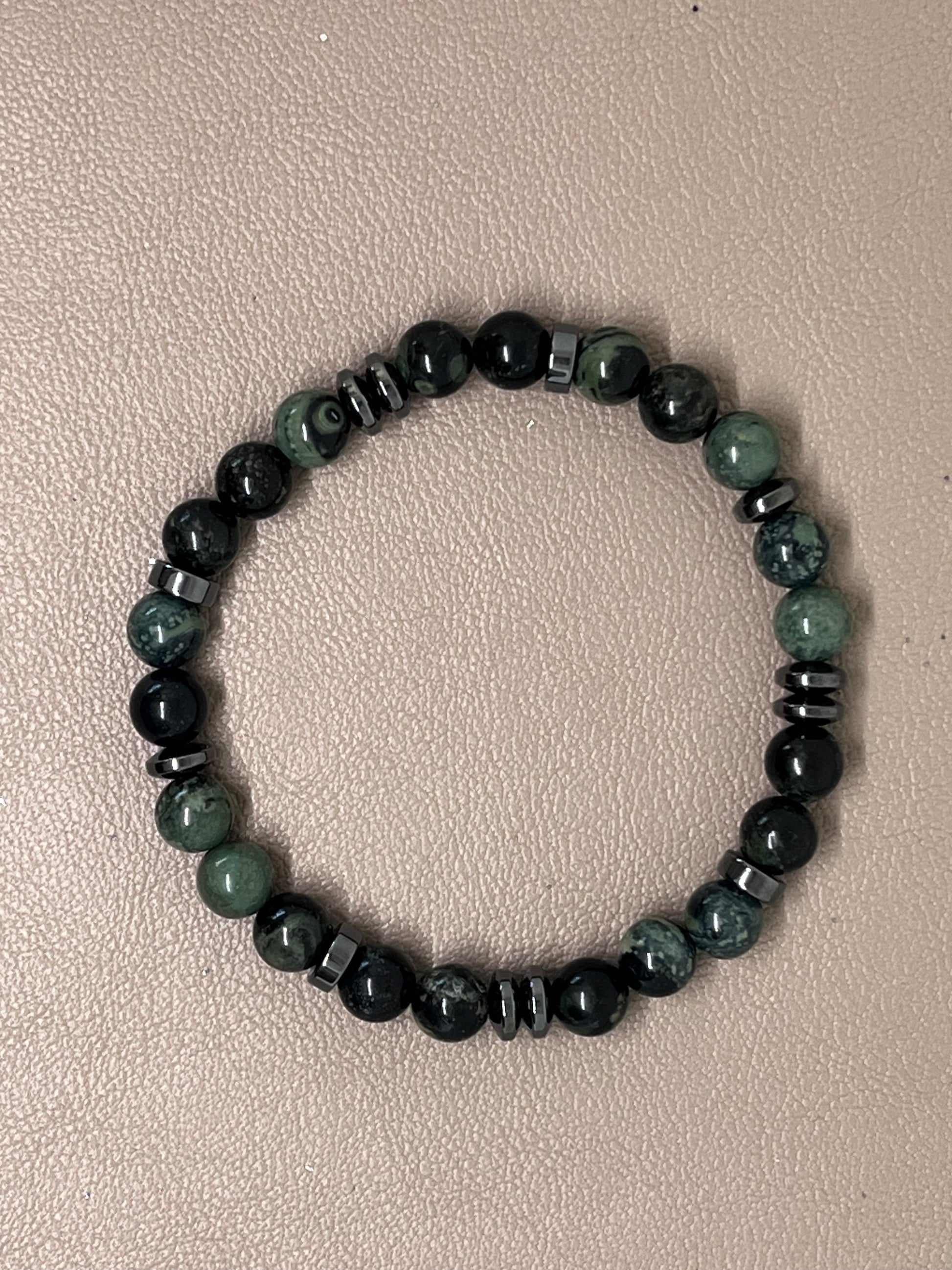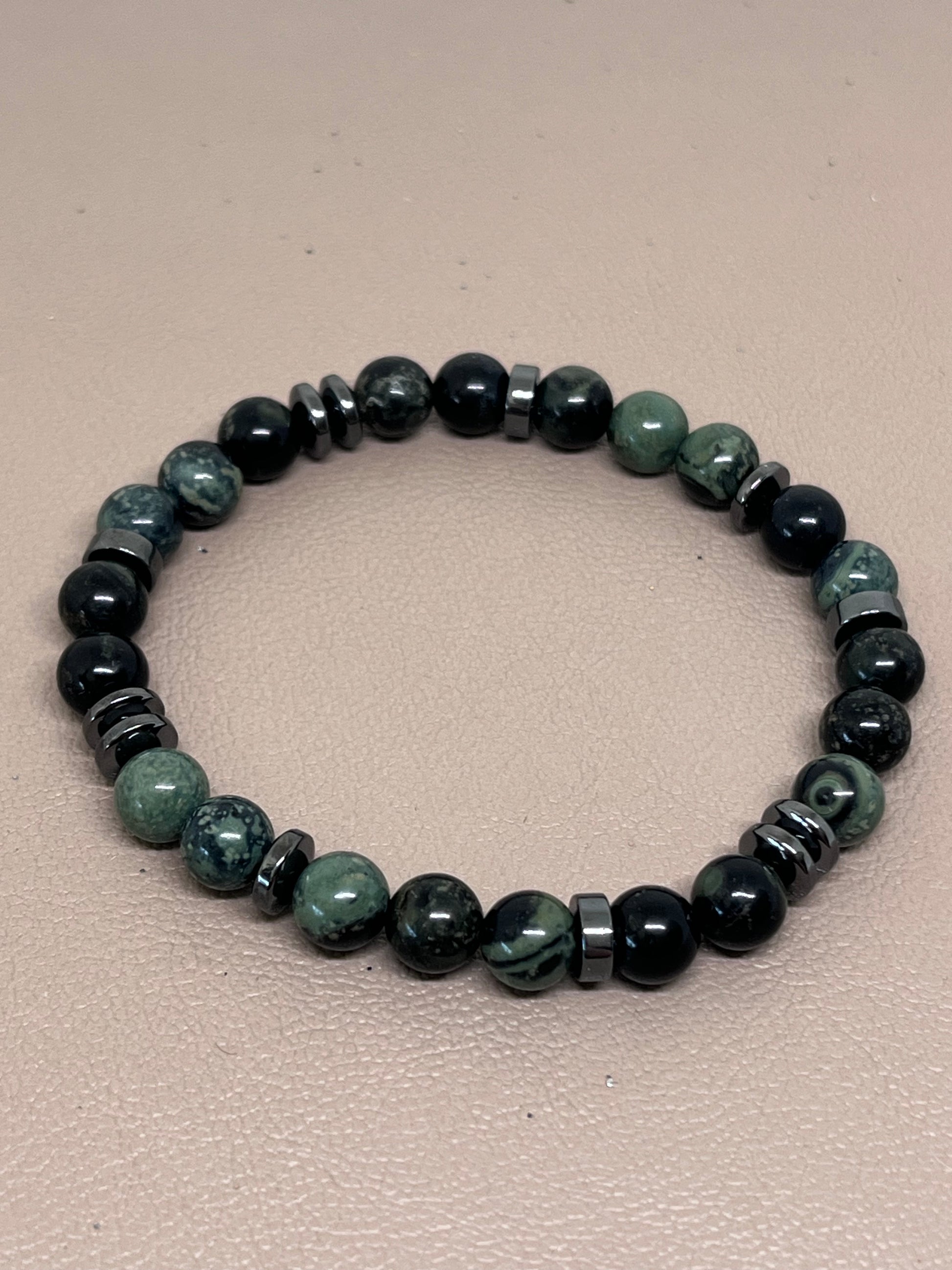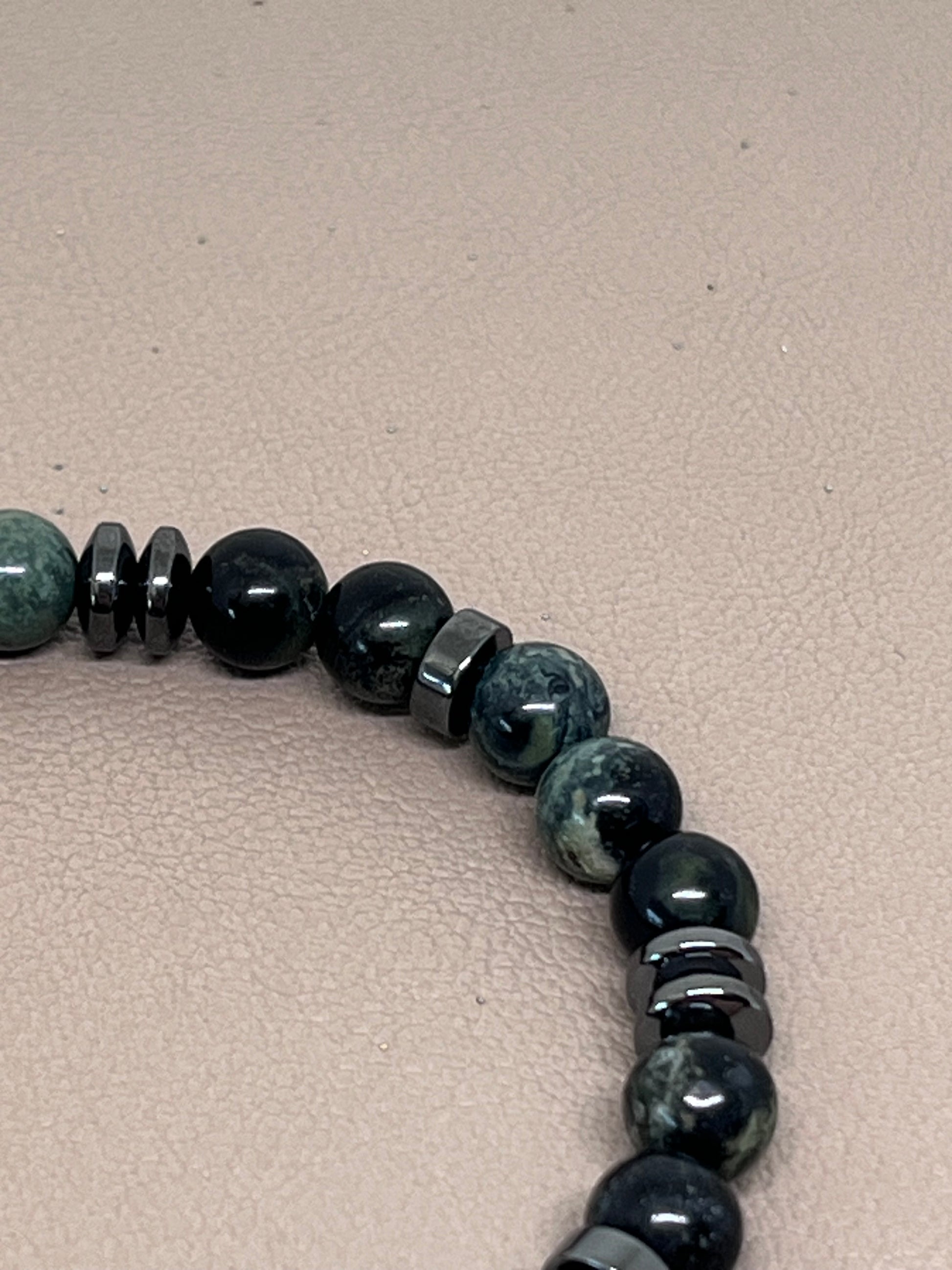 🎨 Farge / steintype: Grønne rhyolittperler 6mm og sort hematitt.