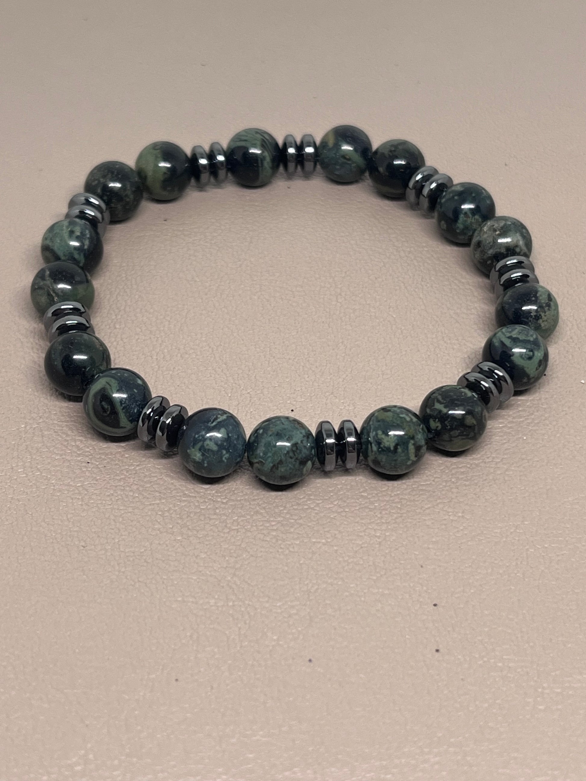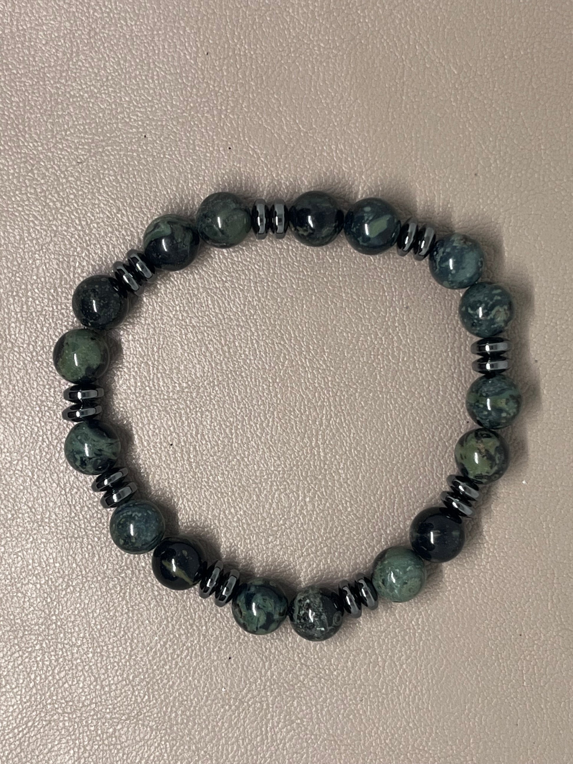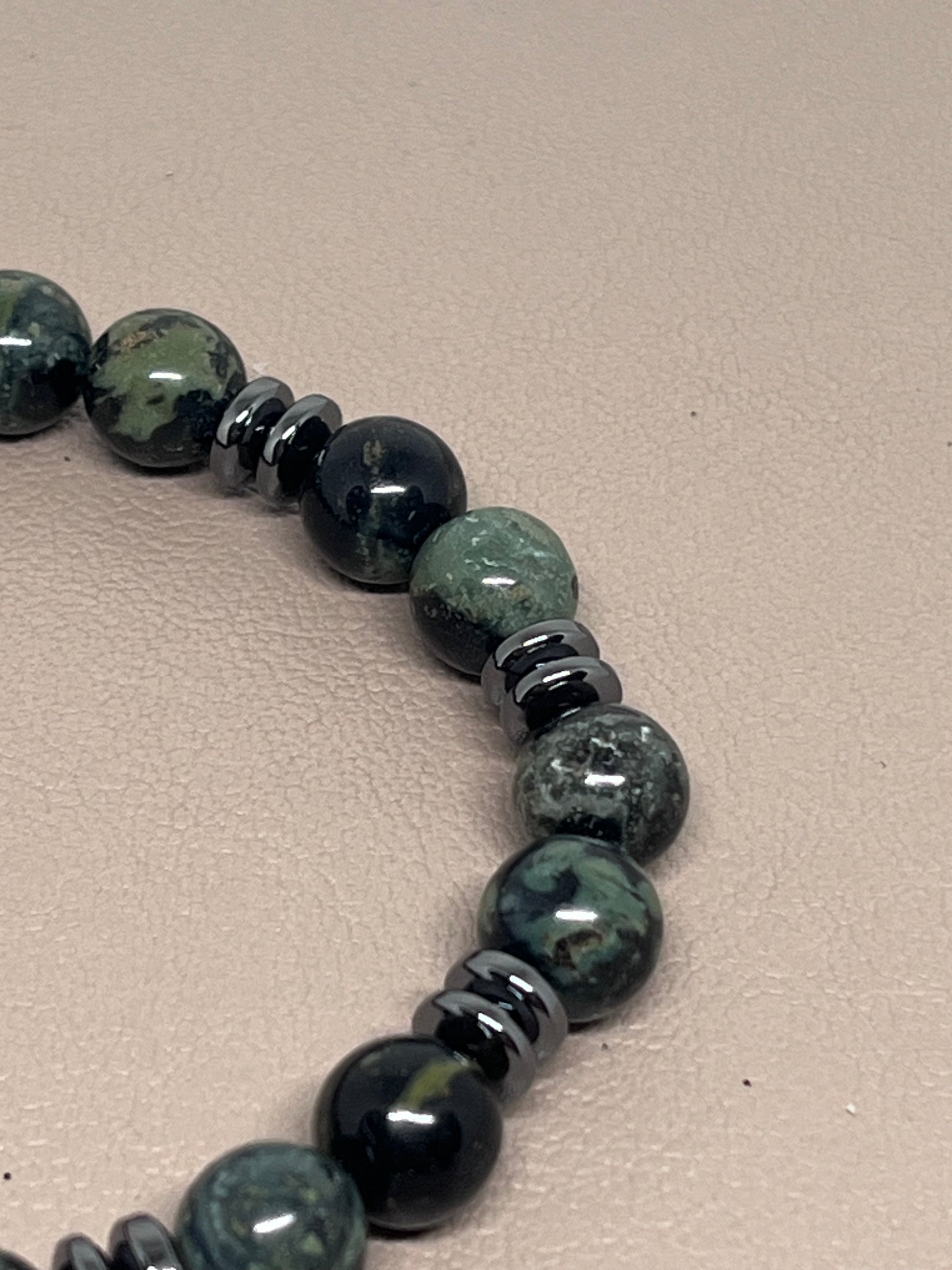 🎨 Farge / steintype: Grønn rhyolittperler 8mm og sort hematitt.