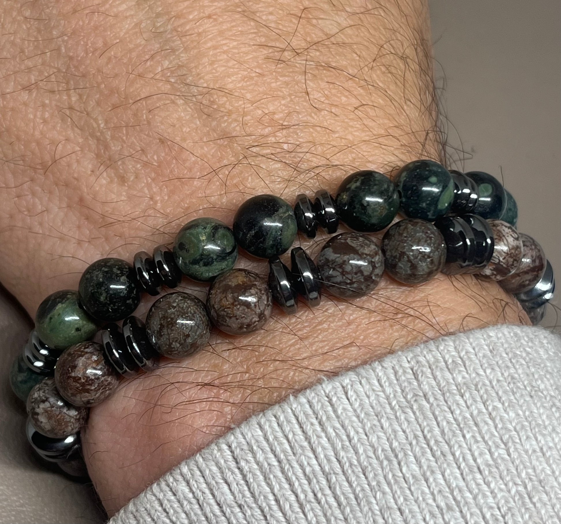 🎨 Farge / steintype: Brun obsidian, grønn rhyolitt og sort hematitt. 8mm.