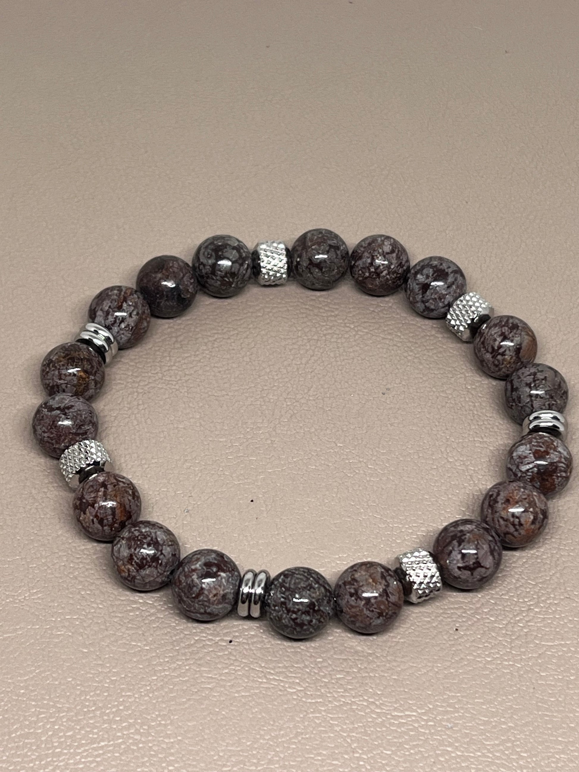 🎨 Farge / steintype: Brune snøfnugg obsidianperler 8mm. Detaljer i rustfritt stål.