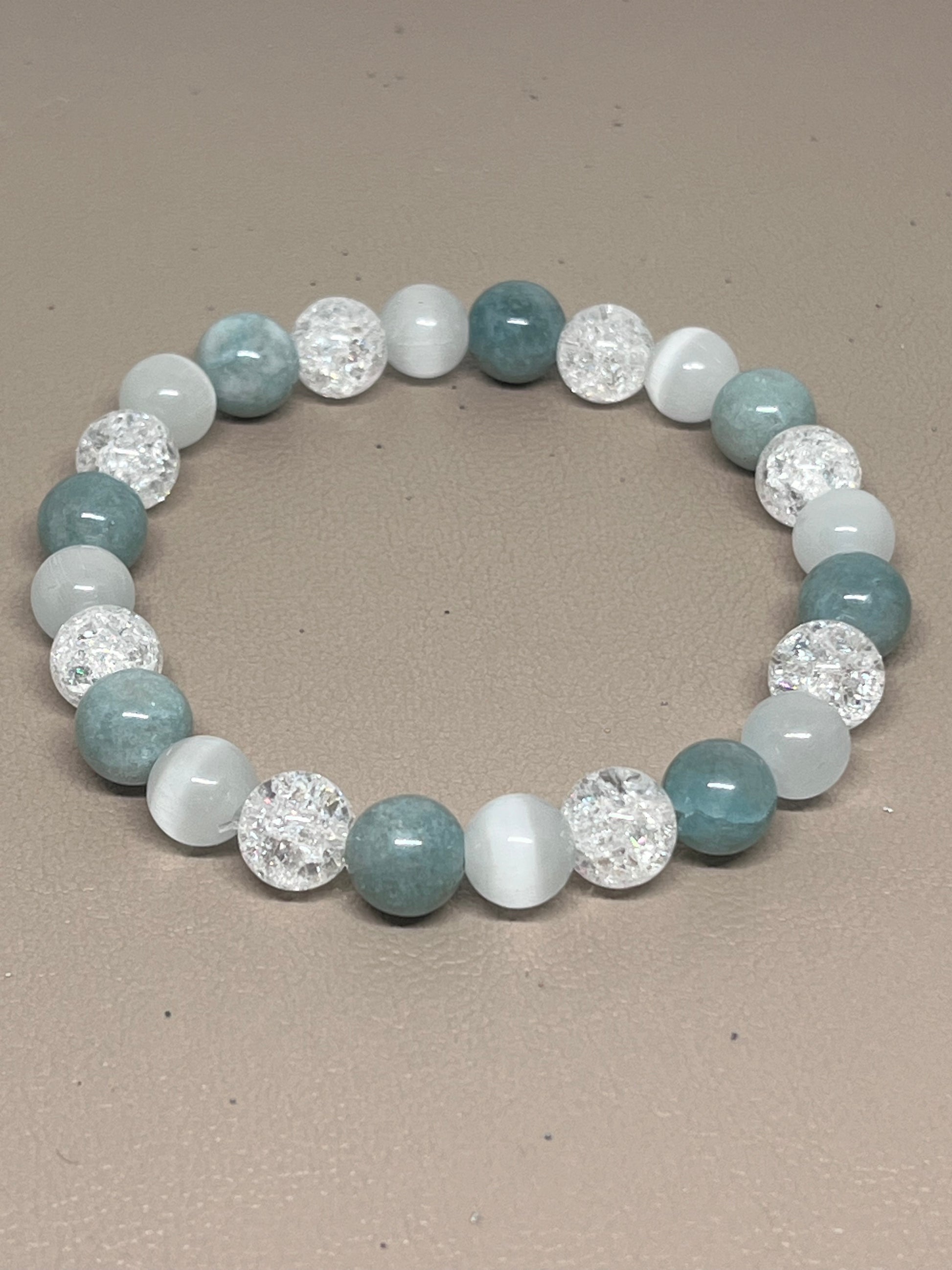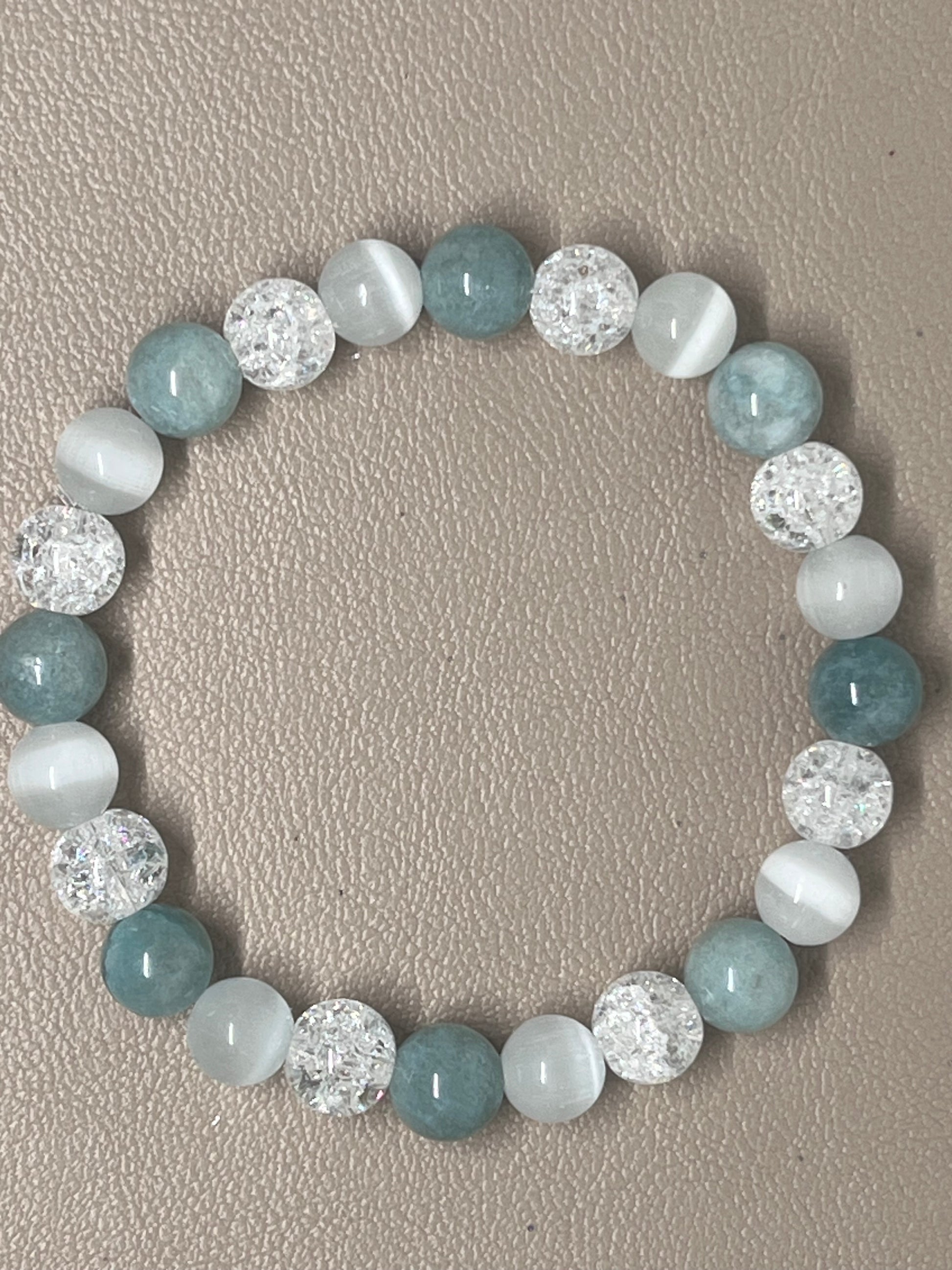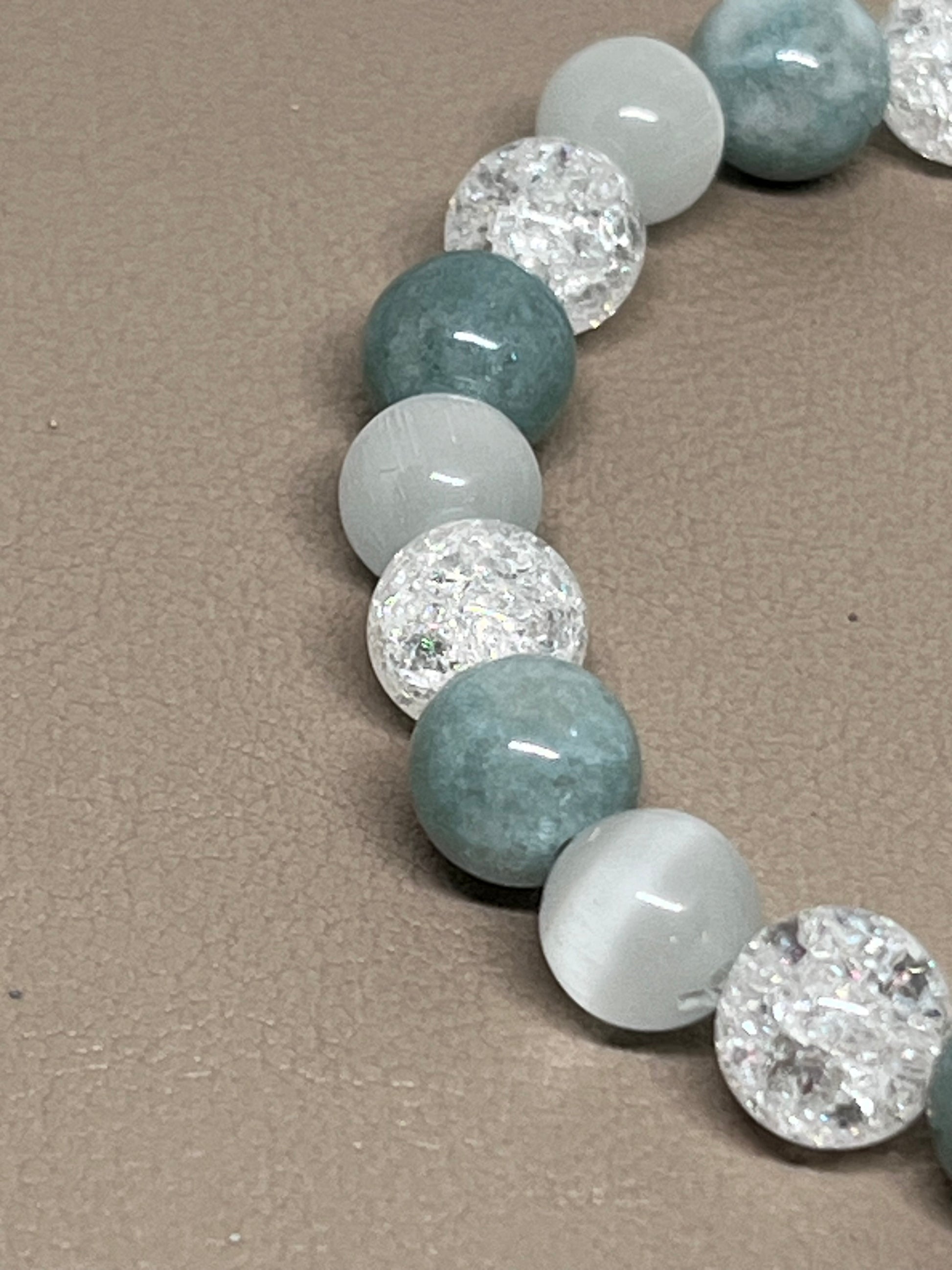 🎨 Farge / steintype: Grønne burmesisk jadeperler, krakkelert kvarts, og hvite katteøyne: 8 mm.