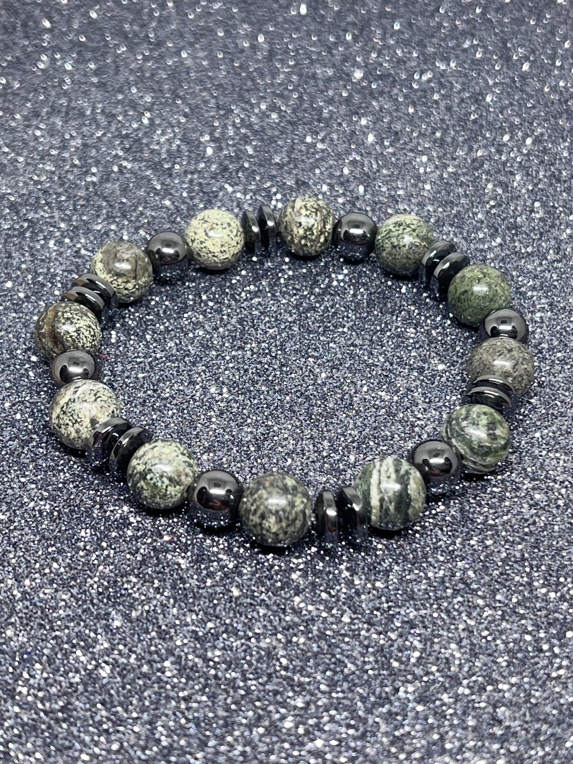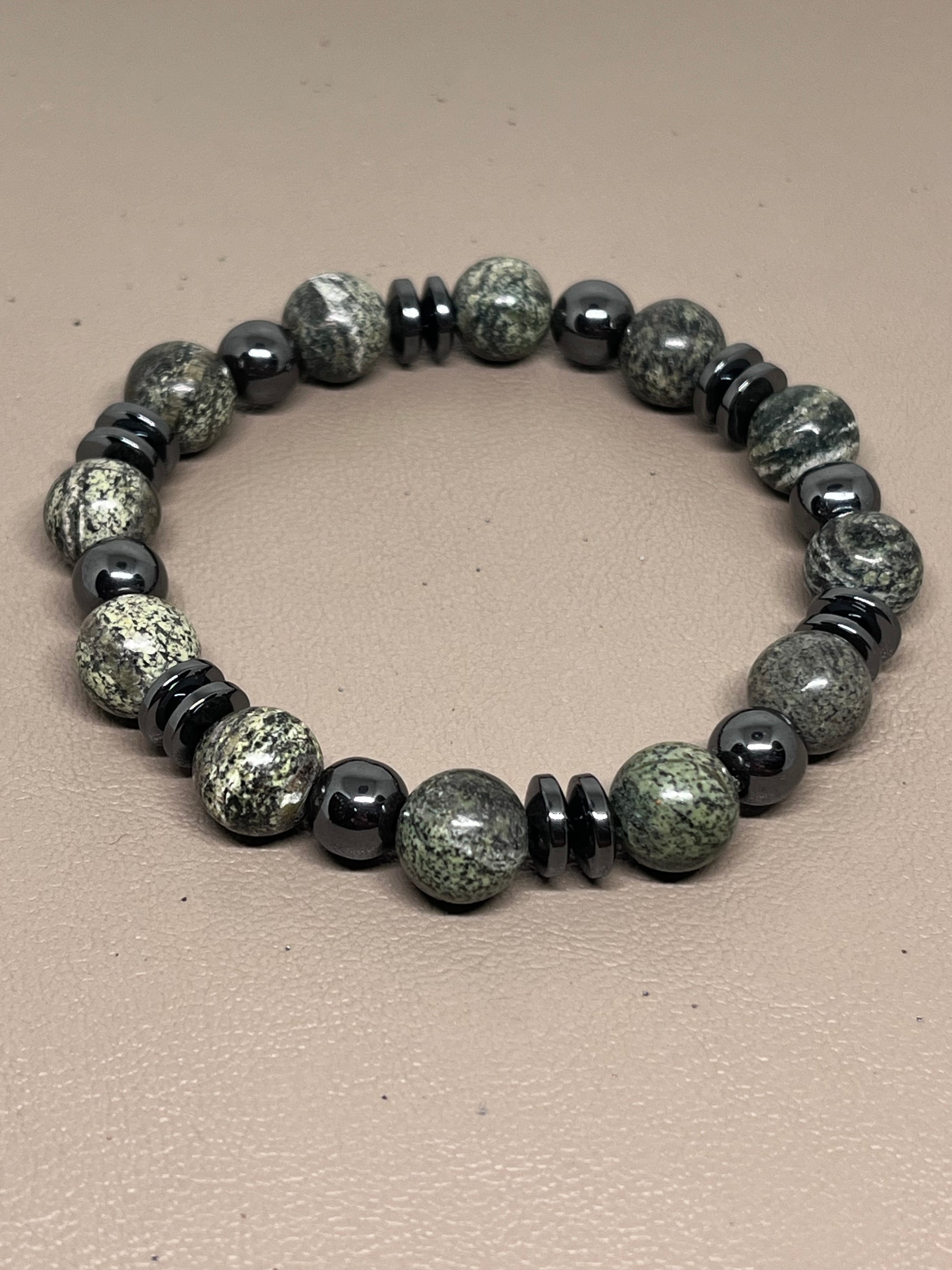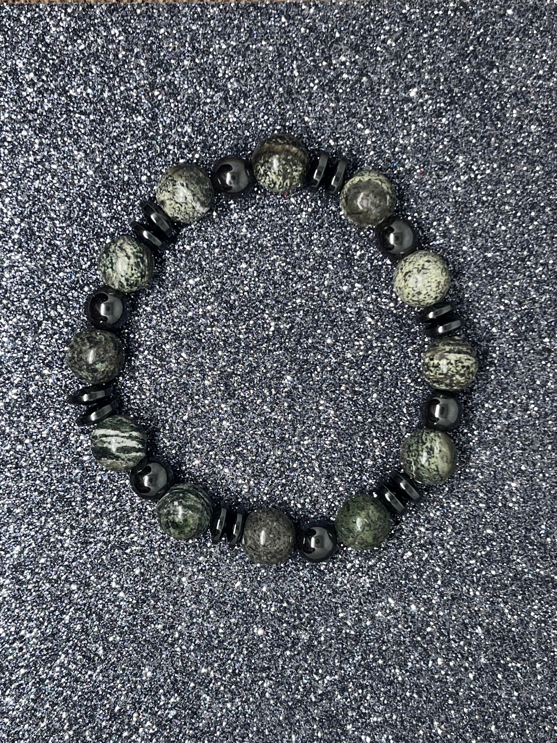 🎨 Farge / steintype: Grønne zebra Jasper perler 10mm og sort hematitt.
