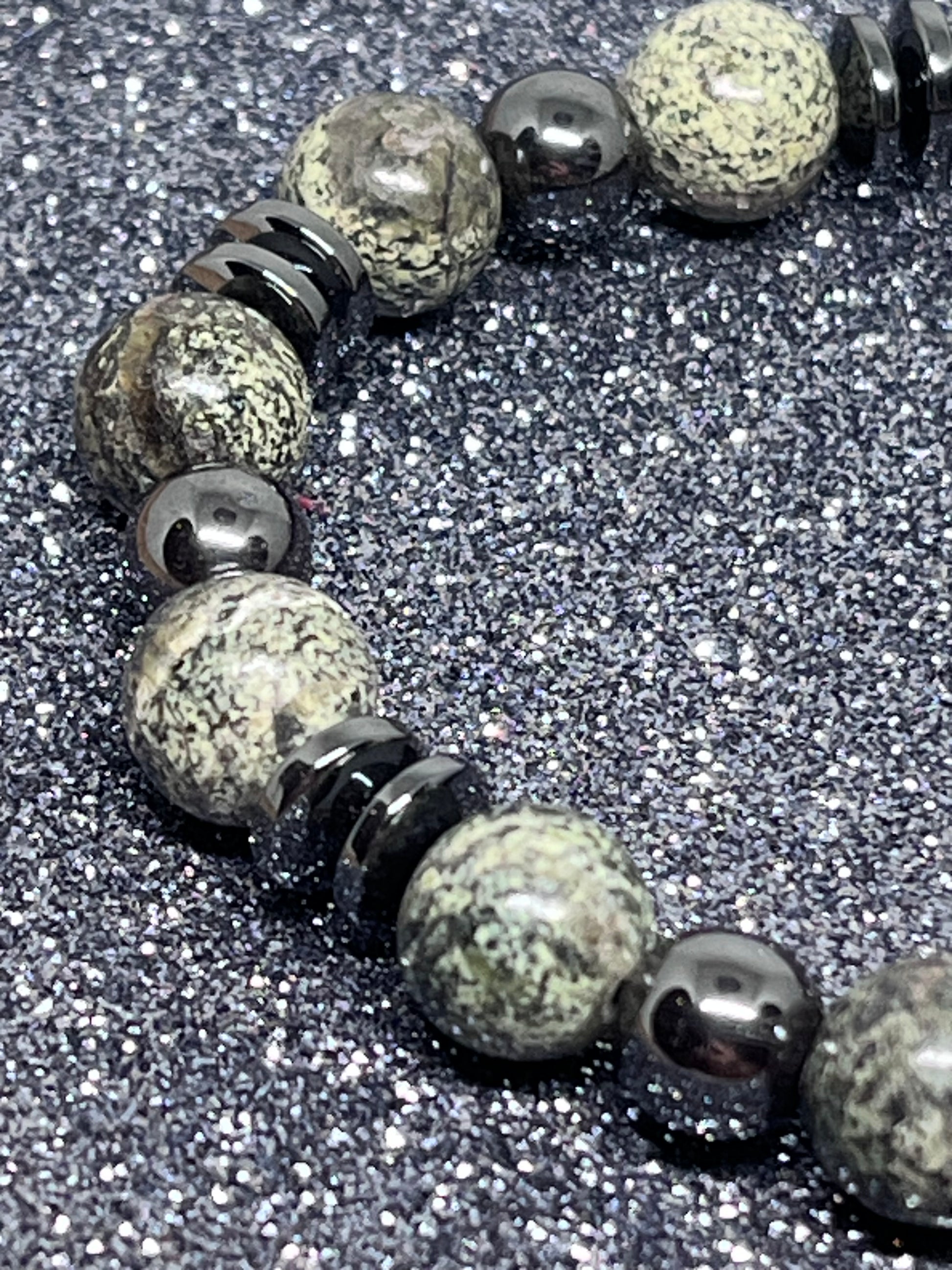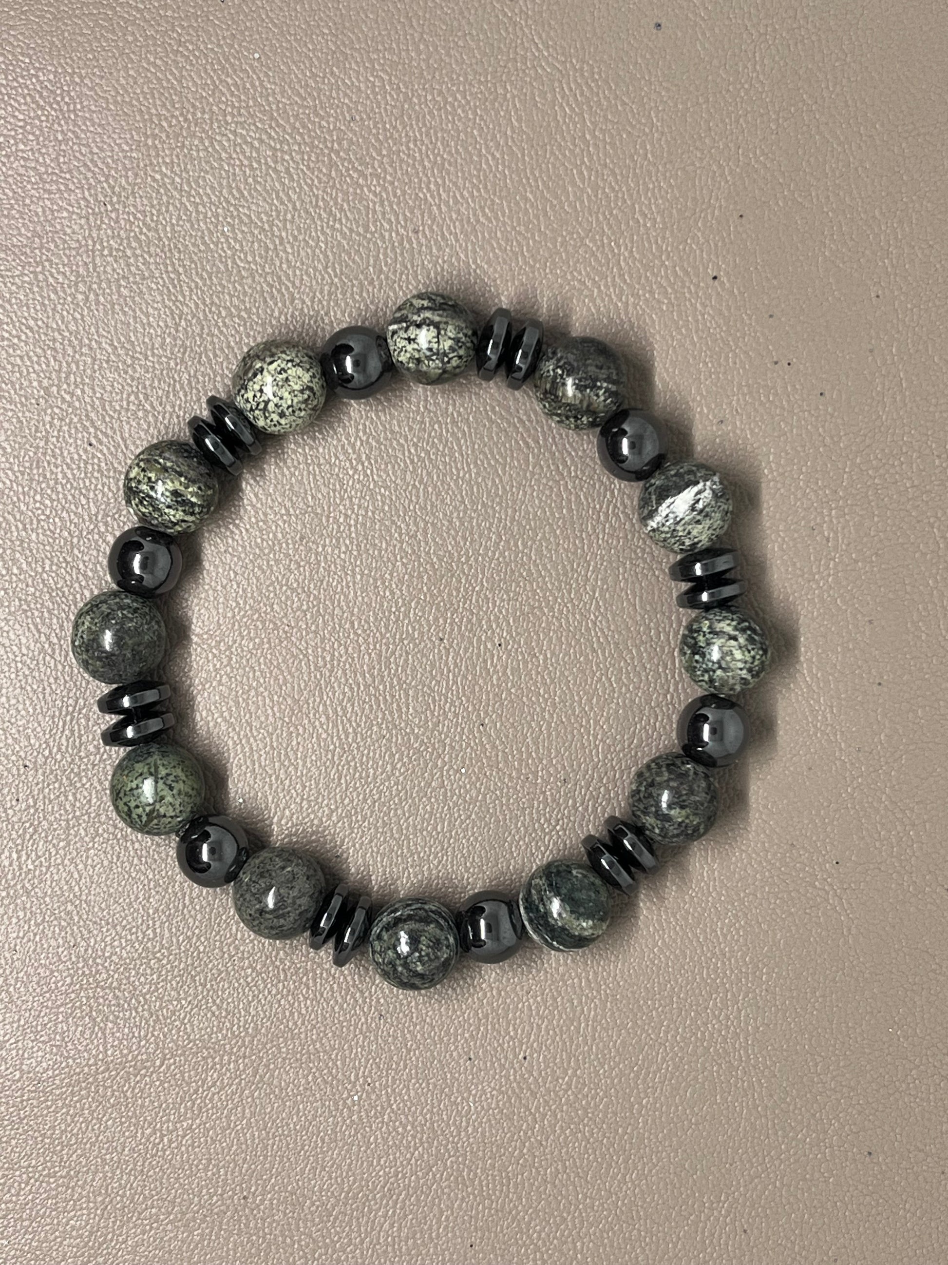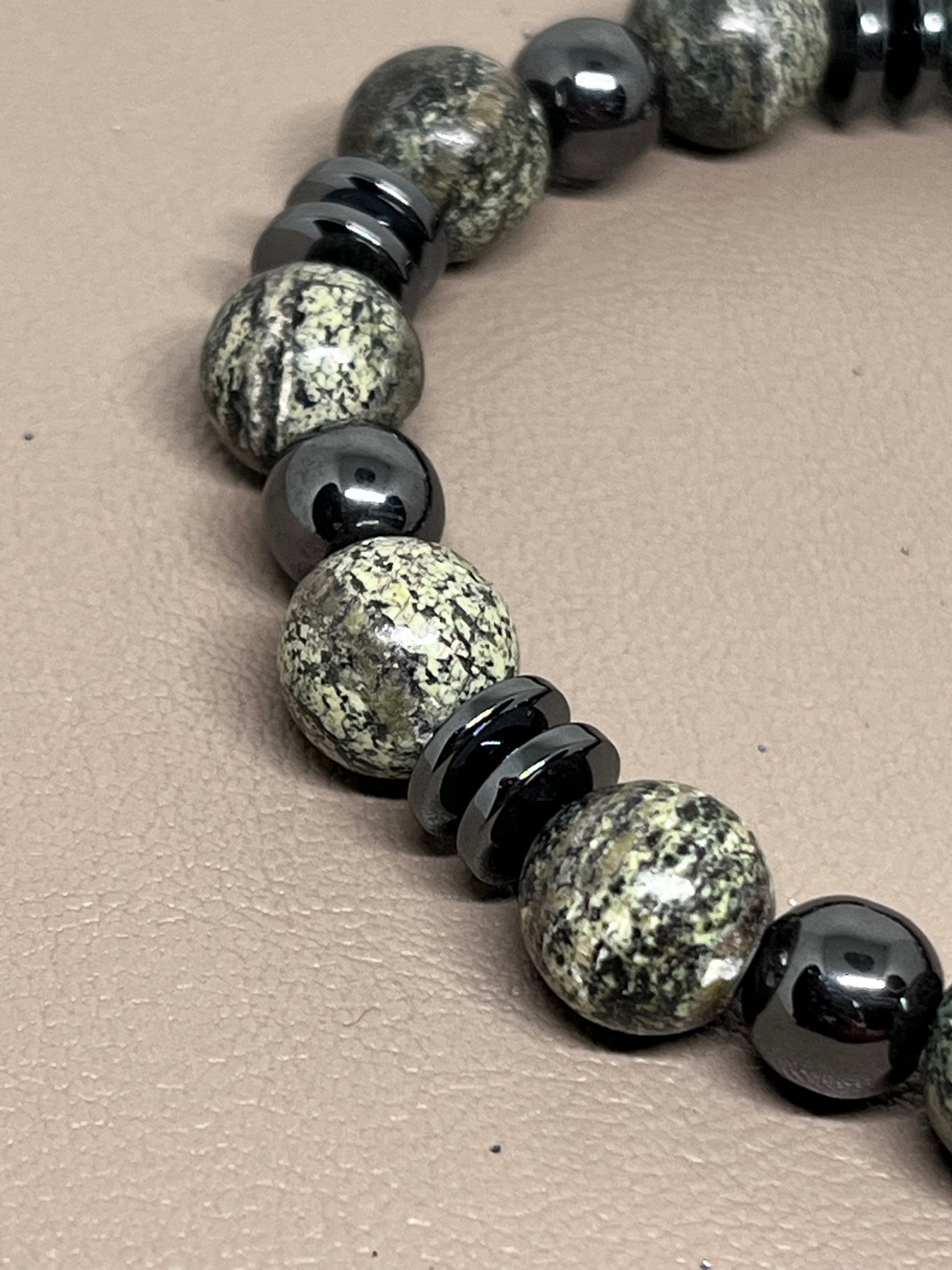 🎨 Farge / steintype: Grønne zebra Jasper perler 10mm og sort hematitt.